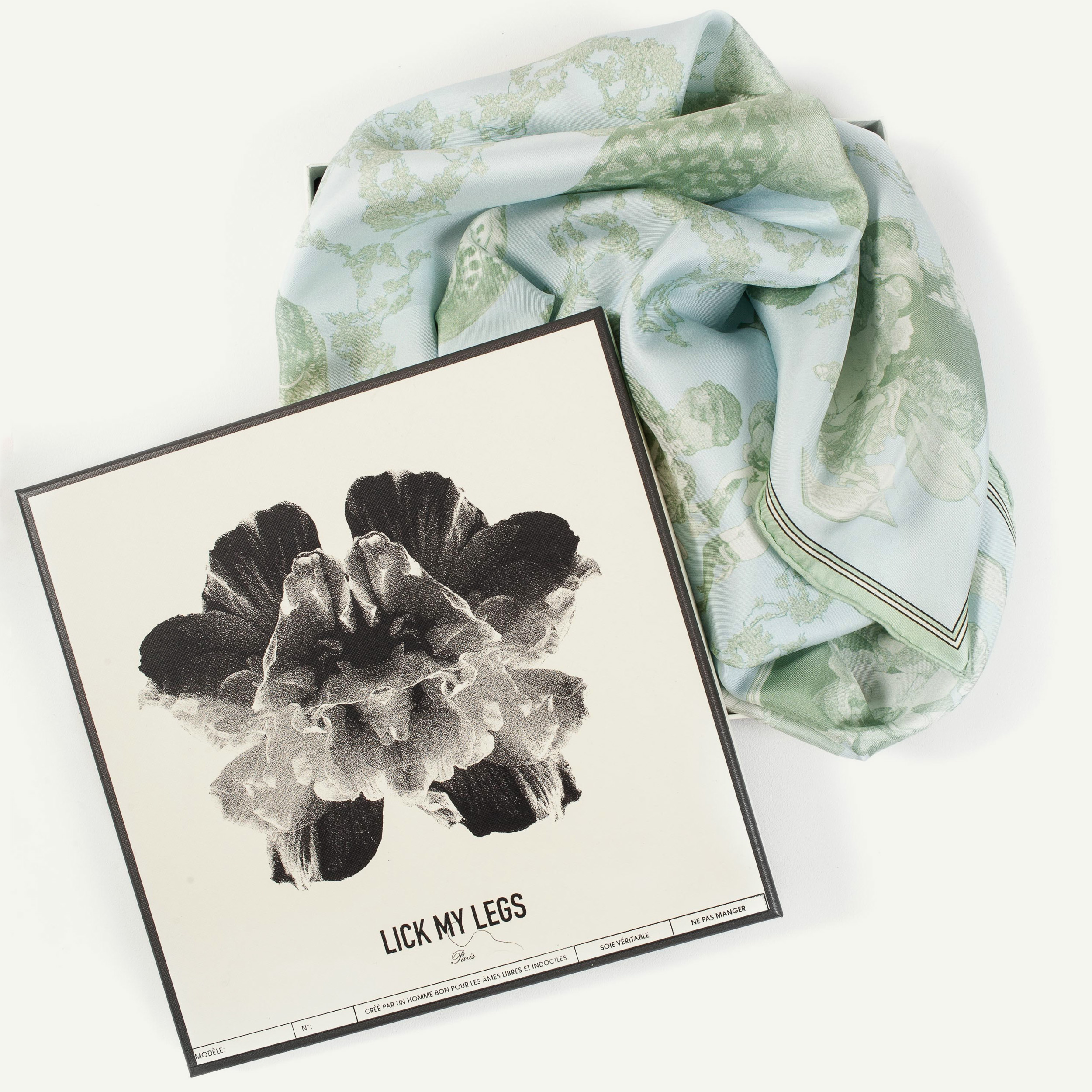 carré en twill de soie 16 mommes, roulottage à la main. Numéroté. Lick my legs – paris.