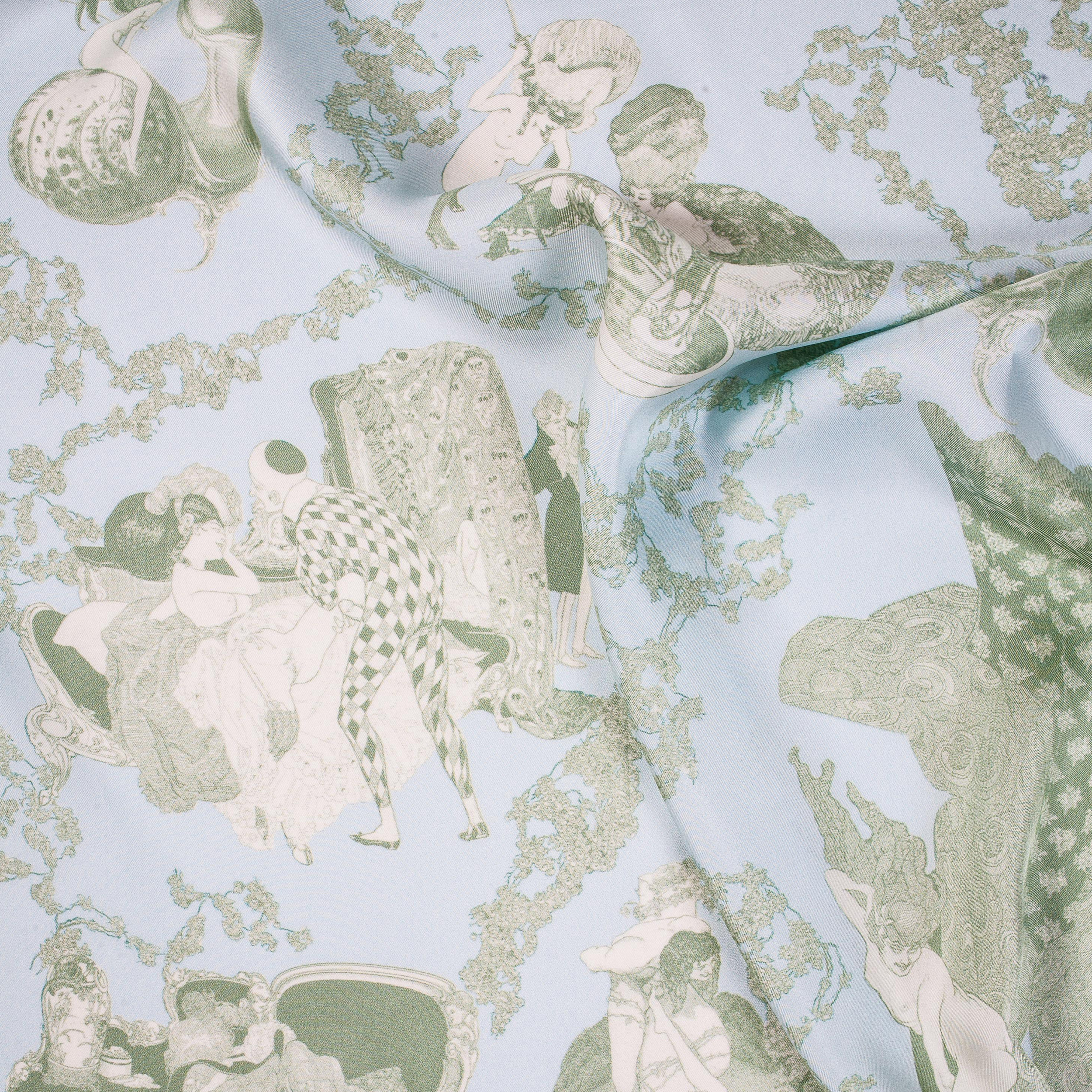 La composition de ce foulard, reprenant librement certaines gravures de Von Bayros illustre au plus prêt l’esprit qui règnait lors de ces soirées.